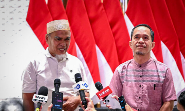 Dua guru asal Kabupaten Luwu Utara, Sulawesi Selatan, yaitu Drs. Abdul Moeis dan Drs. Rasnal, M.Pd, memberikan keterangan pers kepada awak media usai menerima surat rehabilitasi dari Presiden Prabowo Subianto pada Kamis, 13 November 2025, di Pangkalan TNI AU Halim Perdanakusuma Jakarta. (Foto: BPMI Setpres)