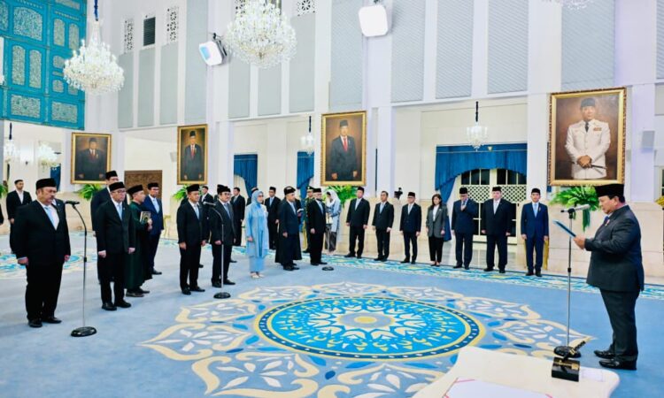 Tampak hadir dalam acara pelantikan yaitu para menteri kabinet Merah Putih, Panglima TNI Jenderal Agus Subiyanto, dan Kapolri Jenderal Listyo Sigit Prabowo. (BPMI Setpres)